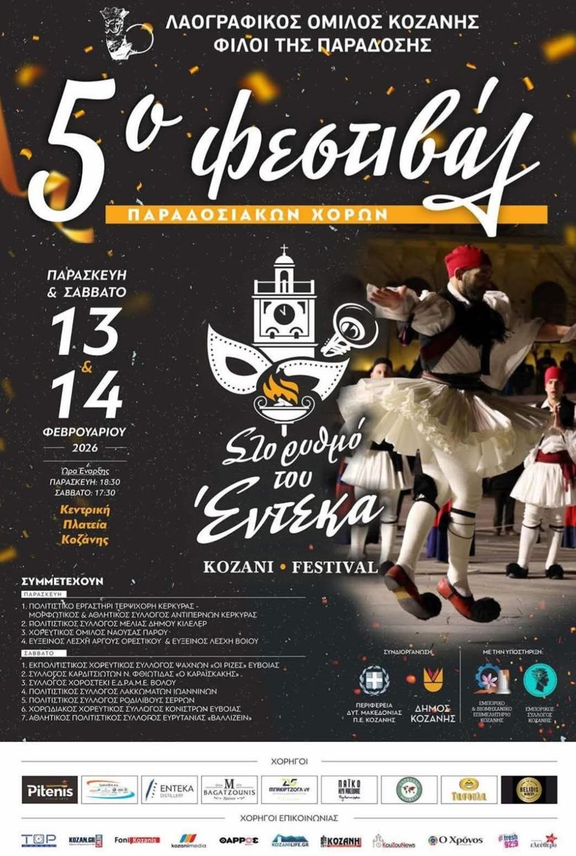 Για 5η συνεχή χρονιά, η Κοζάνη υποδέχεται το 5ο Φεστιβάλ Παραδοσιακών Χορών «Στο ρυθμό του Έντεκα», που διοργανώνει ο Λαογραφικός Όμιλος Κοζάνης – Φίλοι της Παράδοσης, την Παρασκευή 13 και το Σάββατο 14 Φεβρουαρίου 2026, στην Κεντρική Πλατεία Κοζάνης. Το φεστιβάλ, που έχει πλέον καθιερωθεί ως θεσμός για την πόλη, φέρνει στο προσκήνιο τον πλούτο της ελληνικής παράδοσης, με χορευτικά συγκροτήματα από διάφορες περιοχές της χώρας να παρουσιάζουν αυθεντικούς παραδοσιακούς χορούς, ήθη και έθιμα.