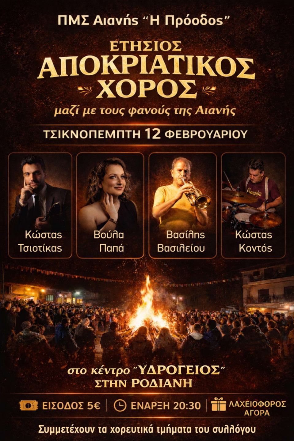 Την Τσικνοπέμπτη, 12 Φεβρουαρίου 2026, ο ΠΜΣ Αιανής «Η Πρόοδος» διοργανώνει τον ετήσιο χορό του μαζί με τους φανούς Αιανής.