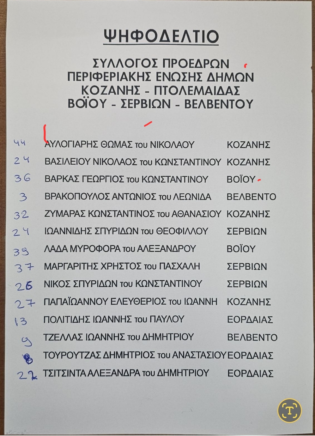 Πρώτος σε ψήφους ο Πρόεδρος της Κοινότητας Κοζάνης Θ. Αυλογιάρης στην εκλογική διαδικασία για την ανάδειξη του 9μελους Δ.Σ. της Ένωσης Κοινοτήτων Περιφερειακής Ενότητας Κοζάνης, που πραγματοποιήθηκαν την Κυριακή 8 Φεβρουαριου. Αναλυτικά η σταυροδοσία.