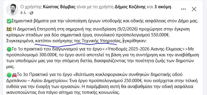 Σε ανάρτησή του στο facebook o Αντιδήμαρχος Tεχνικών Υπηρεσιών στο Δήμο Κοζάνης Κώστας Βόμβας αναφέρει: “Σημαντικά βήματα για την υλοποίηση έργων υποδομής και οδικής ασφάλειας στον Δήμο μας.