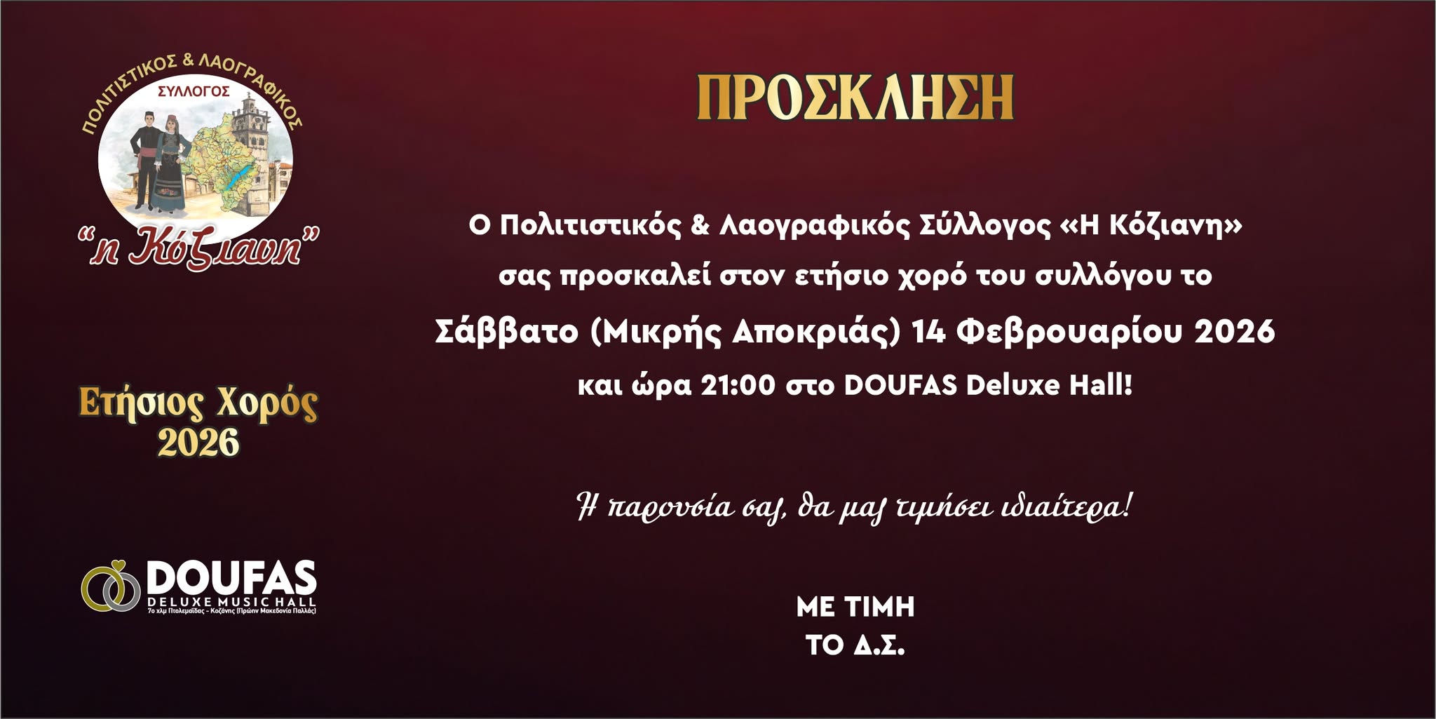 Ο Πολιτιστικός & Λαογραφικός Σύλλογος «Η Κόζιανη» έχει την τιμή να σας προσκαλέσει στον ετήσιο χορό του συλλόγου μας, ο οποίος θα πραγματοποιηθεί το Σάββατο 14 Φεβρουαρίου 2026 (Μικρή Αποκριά) και ώρα 21:00 στο Doufas Deluxe Hall. Η παρουσία σας θα μας τιμήσει ιδιαίτερα και θα αποτελέσει χαρά για εμάς.