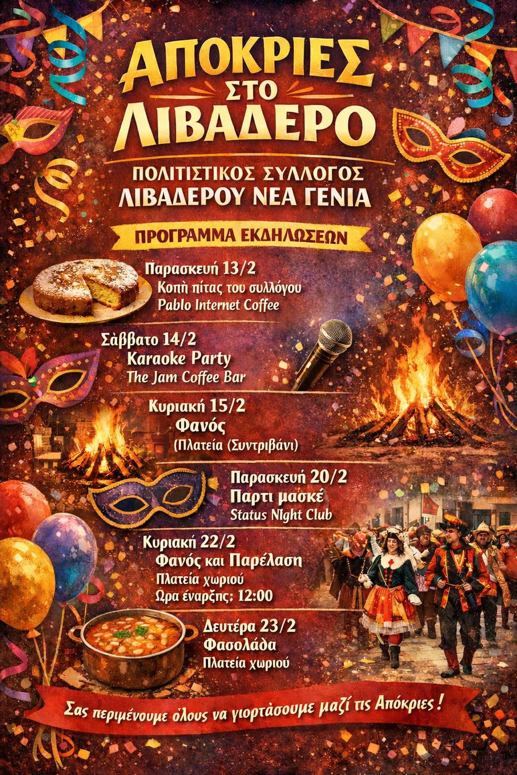Οι Απόκριες στο Λιβαδερό ξεκινούν – Ο Πολιτιστικός Σύλλογος Λιβαδερού Νέα Γενιά σας προσκαλεί σε μια σειρά εκδηλώσεων από 13 έως 23 Φεβρουαρίου.