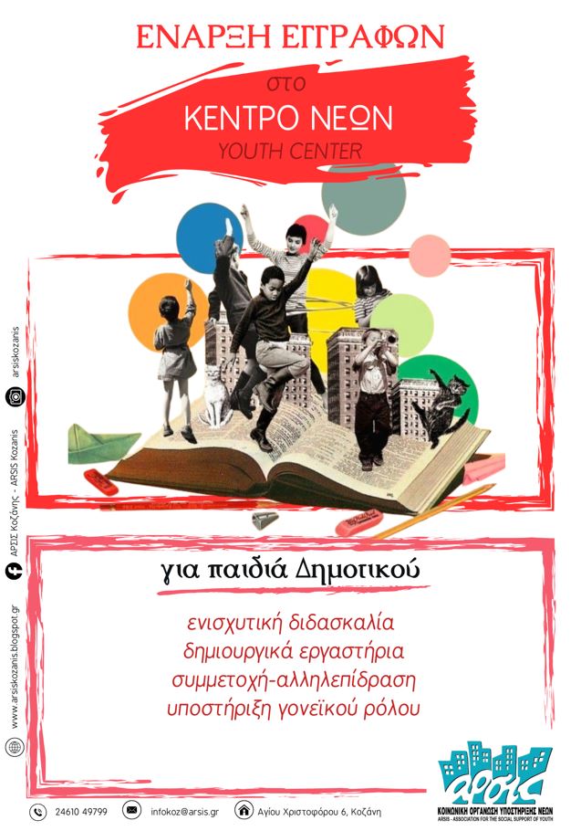 Η ΑΡΣΙΣ Κοζάνης ανακοινώνει με ιδιαίτερη χαρά ότι το Ελεύθερο Σχολείο της, που στήριξε για τόσα χρόνια παιδιά και οικογένειες της περιοχής μας, μεγαλώνει, αλλάζει και εξελίσσεται σε ένα σύγχρονο Κέντρο Νέων – Youth Center. Στηριζόμενο στις αξίες της κοινότητας και στις αρχές του εθελοντισμού σχεδιάσαμε πάνω σε νέες ιδέες υποστήριξης, ανάπτυξης δεξιοτήτων και συμπερίληψης για όλα τα παιδιά, χωρίς διακρίσεις και αποκλεισμούς.