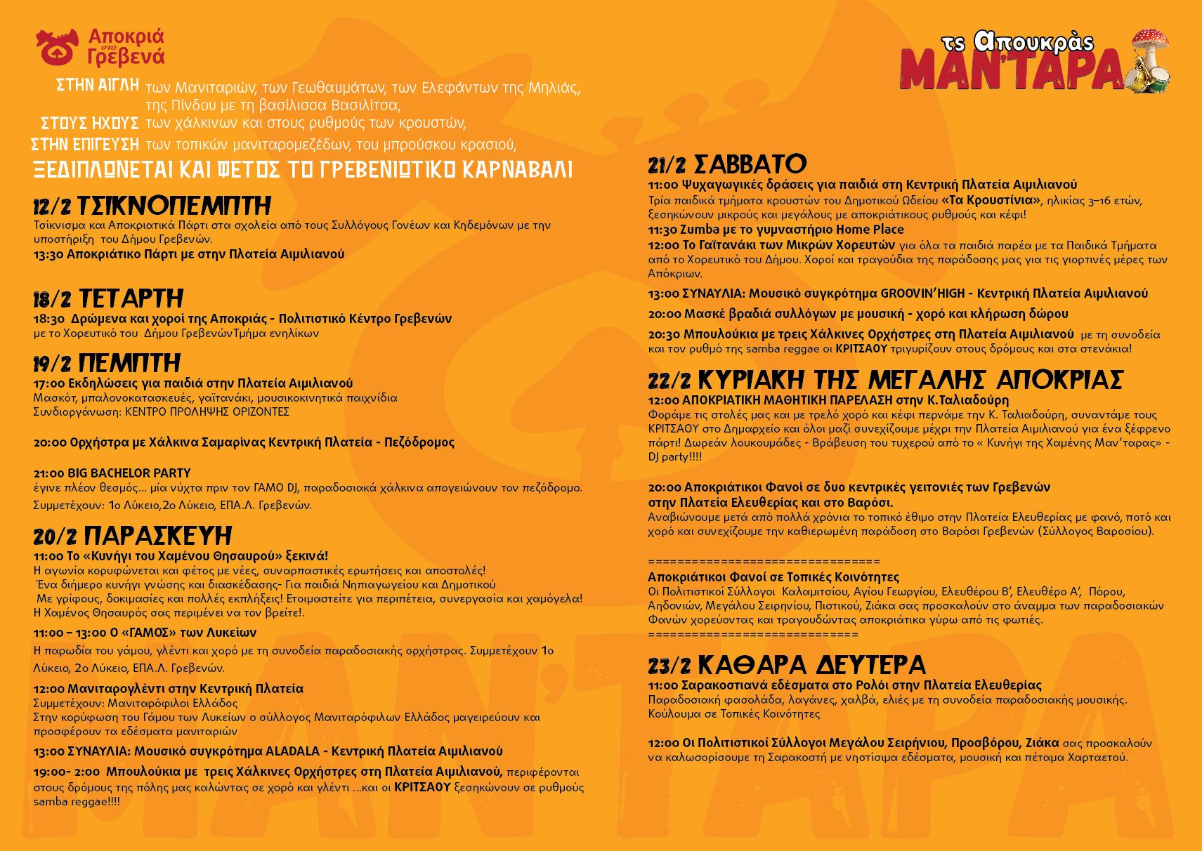 Στα Γρεβενά των μανιταριών και των γεύσεων, των χάλκινων και των κρουστών, της παράδοσης που αντηχεί στις πλατείες και στα σοκάκια και του κεφιού που ενώνει μικρούς και μεγάλους, ξεδιπλώνεται και φέτος το Γρεβενιώτικο Καρναβάλι «ΤΣ΄ ΑΠΟΥΚΡΑΣ ΜΑΝ’ΤΑΡΑ»!!!