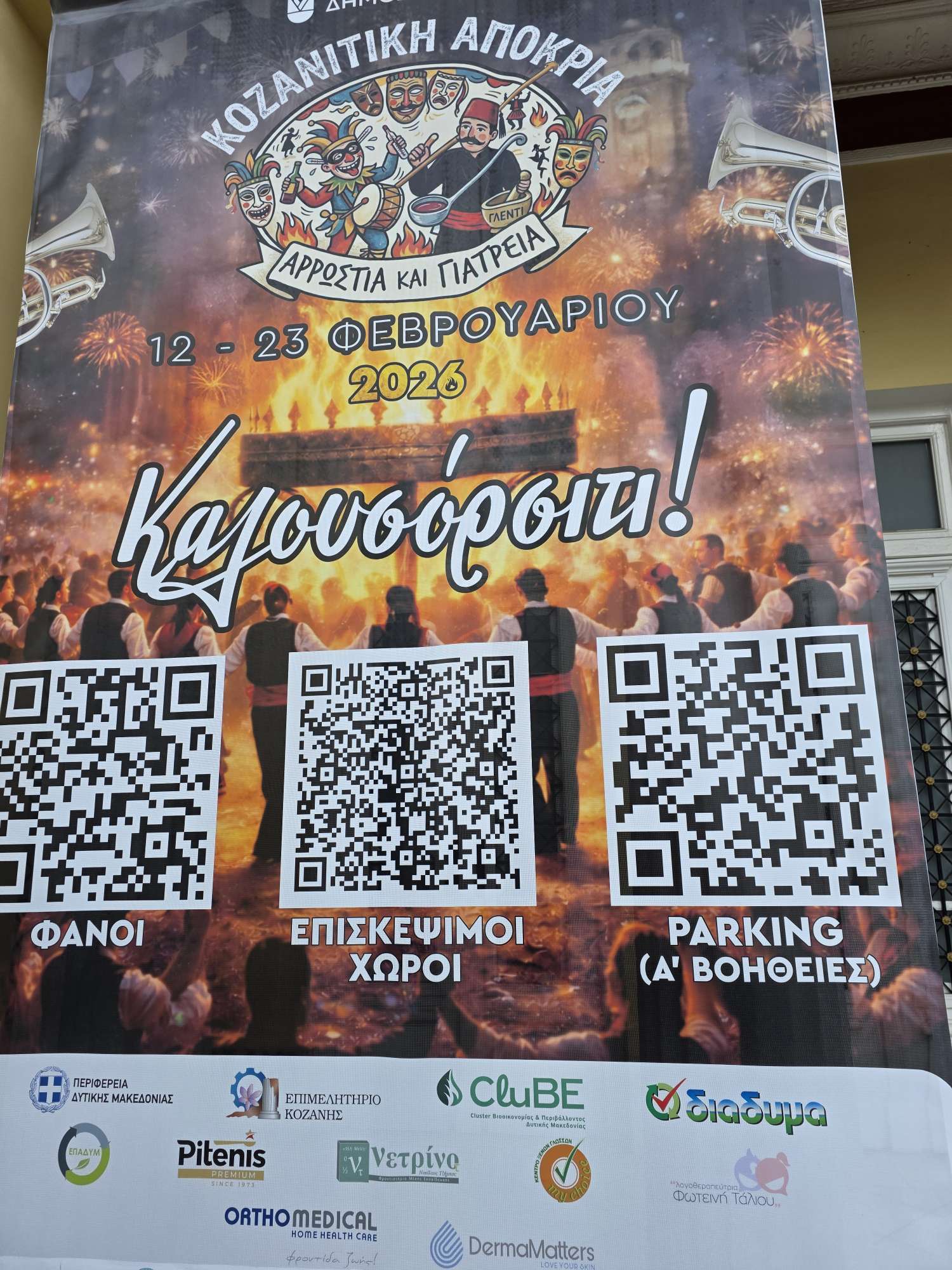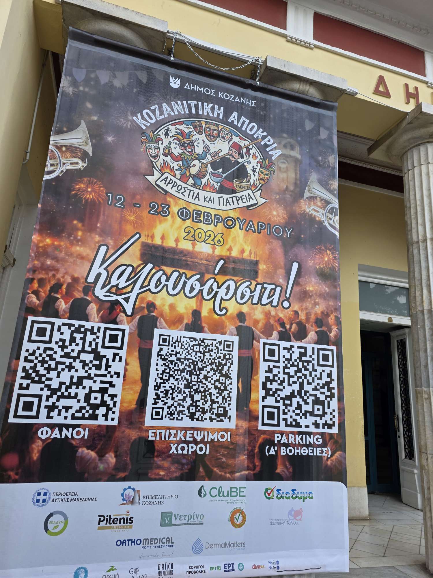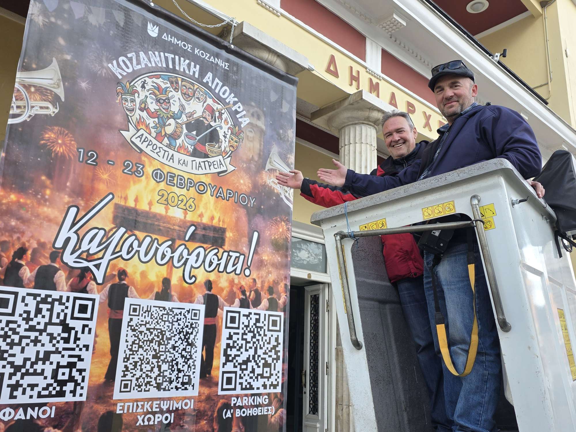 Τοποθετήθηκε στο δημαρχείο Κοζάνης η αφίσα- πανό της Αποκριάς. Οι Βασίλης Βακρατσάς και Χρήστος Παπαβασιλείου, από την υπηρεσία του Δήμου κοζάνης, που τοποθέτησαν το πάνο, σας εύχονται καλές αποκριές