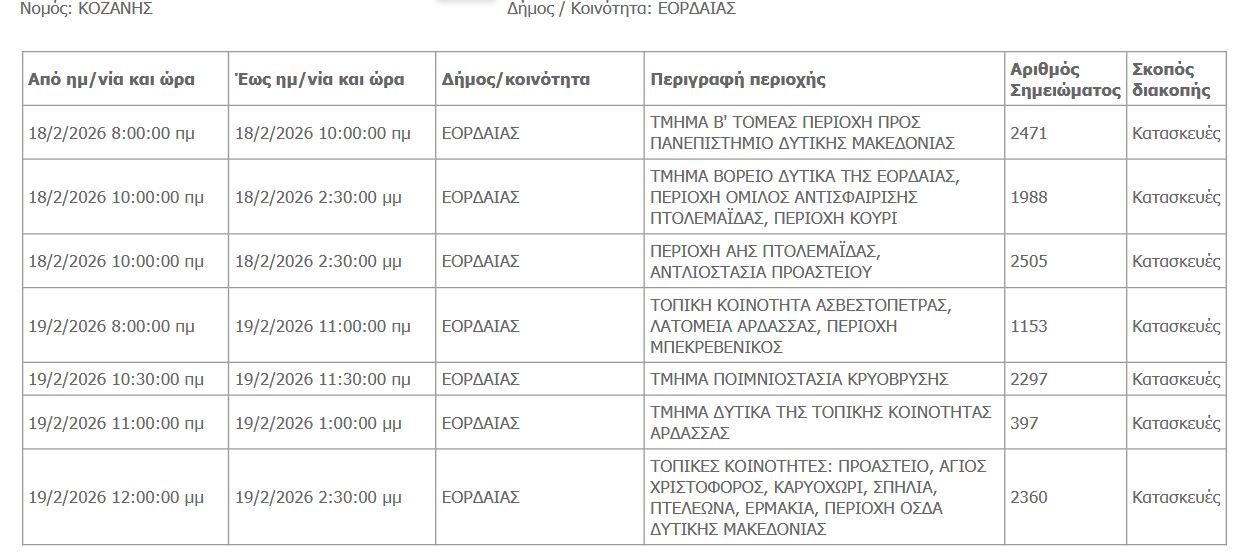 Προγραμματισμένες διακοπές ηλεκτροδότησης στις 18 και 19 Φεβρουαρίου σε περιοχές της Εορδαίας.