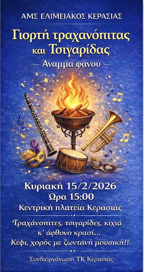 Ο ΑΜΣ Ελιμειακός Κερασιάς σας προσκαλεί στη Γιορτή τραχανόπιτας – τσιγαρίδας που διοργανώνει την Κυριακή 15/02/2026 και ώρα 15:00 στην κεντρική πλατεία του χωριού. Σας περιμένουν οι πεντανόστιμες τραχανόπιτες, φτιαγμένες απο τις γυναίκες του χωριού, τσιγαρίδες και άφθονο κρασί!