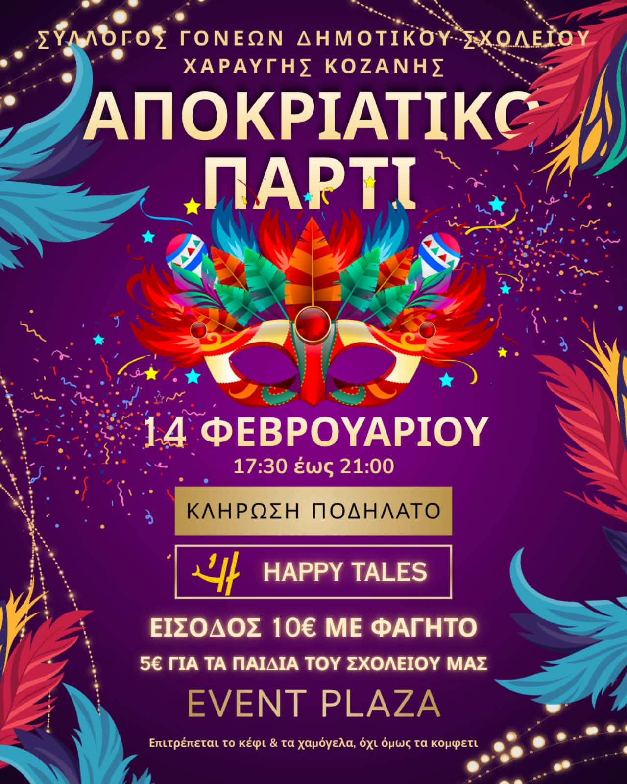 Αποκριάτικη εκδήλωση διοργανώνει ο Σύλλογος Γονέων του Δημοτικού Σχολείου Χαραυγής Κοζάνης, το Σάββατο 14 Φεβρουαρίου, από τις 17:30 έως τις 21:00, στον χώρο του Event Plaza. Το αποκριάτικο πάρτι υπόσχεται κέφι, μουσική και ψυχαγωγία για μικρούς και μεγάλους, ενώ στο πρόγραμμα περιλαμβάνεται και κλήρωση ποδηλάτου. Τη διασκέδαση των παιδιών θα αναλάβει η ομάδα των Happy Tales, με δράσεις και εκπλήξεις.