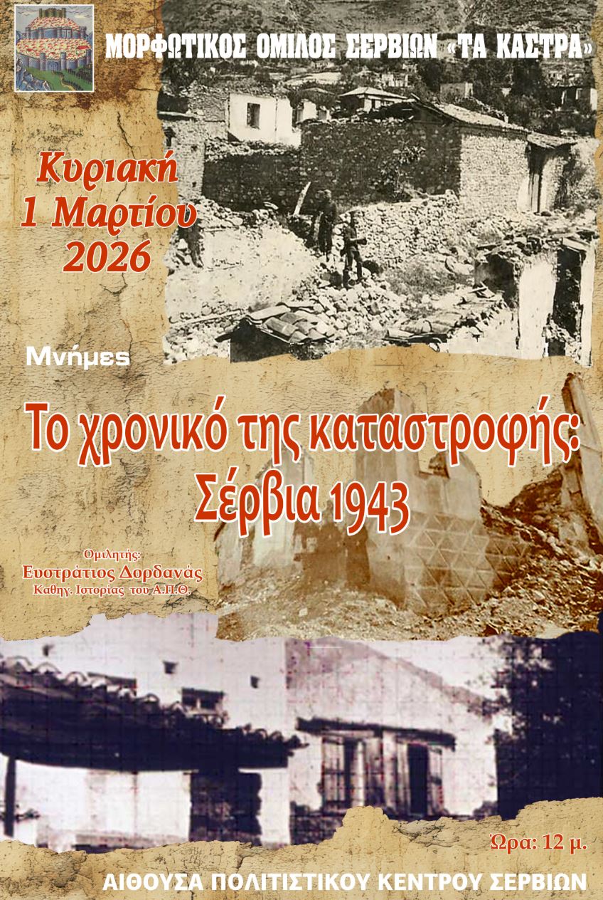 Ο Μορφωτικός Όμιλος Σερβίων «Τα Κάστρα» σας προσκαλεί να τιμήσουμε την εκδήλωση Μνήμης που διοργανώνει για το Ολοκαύτωμα των Σερβίων, της Μαρτυρικής Πόλης μας —Μάρτος 1943—, την Κυριακή, 1η Μαρτίου 2026 και ώρα 12 μ. στην αίθουσα του Πολιτιστικού Κέντρου Σερβίων.