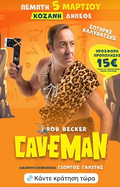 Ο Σωτήρης Καλυβάτσης φοράει προβιά (γνωστού οίκου μόδας) και ανεβαίνει στη σκηνή του Θεάτρου Αθηνών, για να γίνει ο σύγχρονος CAVEMAN: ο άνθρωπος των σπηλαίων της διπλανής πόρτας, ένας πρωτόγονος με Wi-Fi, τηλεκοντρόλ και πιστωτική! Είναι έτοιμος να αποδείξει ότι το αιώνιο μπρα-ντε-φερ μεταξύ άντρα και γυναίκας ξεκίνησε πολύ πριν ανακαλύψουμε το delivery, το Tik-Tok και το γάλα αμυγδάλου.