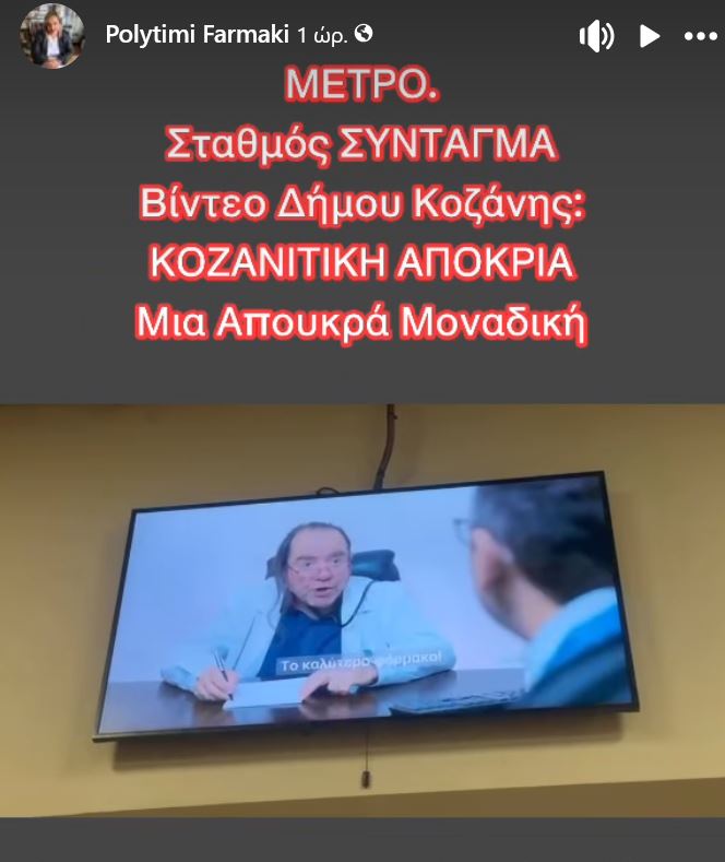 Με μήνυμα ενότητας και κοινής προσπάθειας για την προβολή της περιοχής, η Αντιπεριφερειάρχης Τουρισμού Πολυτίμη Φαρμάκη προχώρησε σε ανάρτηση σχετικά με το τηλεοπτικό σποτ της Κοζανίτικης Αποκριάς, το οποίο προβάλλεται αυτές τις ημέρες σε οθόνες του Μετρό της Αθήνα.