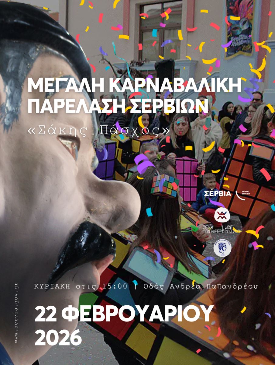 Ο Δήμος Σερβίων προσκαλεί τους πολίτες και τους επισκέπτες της περιοχής στην κορυφαία εκδήλωση της αποκριάτικης περιόδου, τη Μεγάλη Καρναβαλική Παρέλαση «Σάκης Πάσχος», η οποία θα πραγματοποιηθεί την Κυριακή 22 Φεβρουαρίου 2026.