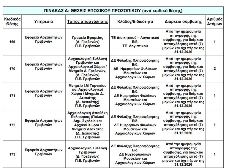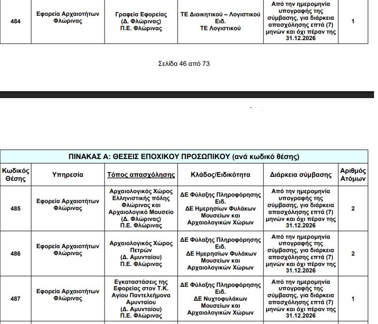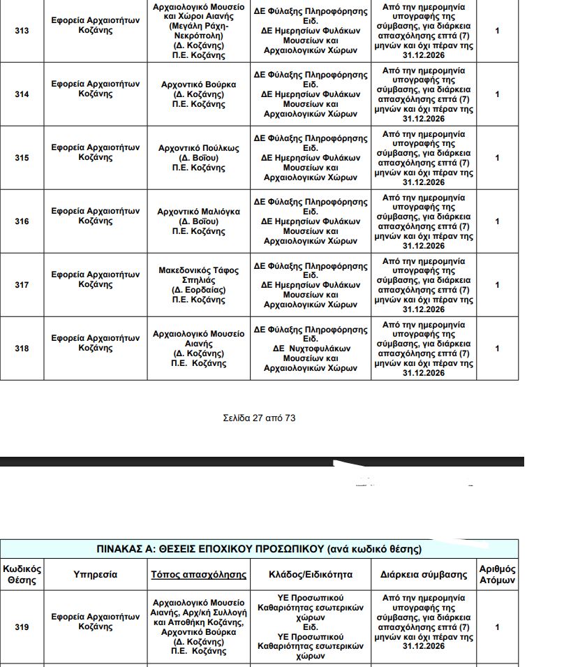To kozan.gr σας παρουσιάζει τις θέσεις στην Δ. Μακεδονία για την προκήρυξη για τις προσλήψεις, με σύμβαση εργασίας ιδιωτικού δικαίου ορισμένου χρόνου, συνολικά χιλίων πεντακοσίων τριάντα οκτώ (1.538) ατόμων για την κάλυψη παροδικών αναγκών στους Αρχαιολογικούς χώρους και Μουσεία