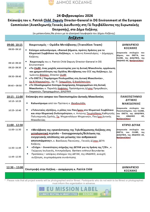 Την Τρίτη 24 Φεβρουαρίου 2026 θα πραγματοποιηθεί στον Δήμο Κοζάνης, επίσκεψη του Αναπληρωτή Γενικού Διευθυντή της Γενικής Διεύθυνσης Περιβάλλοντος της Ευρωπαϊκής Επιτροπής Patrick Child (Πάτρικ Τσάιλντ), στο πλαίσιο της Ευρωπαϊκής Αποστολής των 100 Κλιματικά Ουδέτερων και Έξυπνων Πόλεων της Ευρώπης έως το 2030 και συμμετοχής του Δήμου μας στο εγκεκριμένο Κλιματικό Συμβόλαιο.