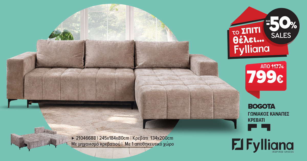 Απευθύνεται σε όλους όσοι αναζητούν πρακτικές λύσεις για την καθημερινότητά τους, χωρίς συμβιβασμούς στην άνεση και την ποιότητα. Στο πλαίσιο των χειμερινών εκπτώσεων, ο καναπές-κρεβάτι BOGOTA διατίθεται με προνομιακή τιμή, όπως παρουσιάζεται και στο πρόσφατο τηλεοπτικό σποτ της εταιρείας.