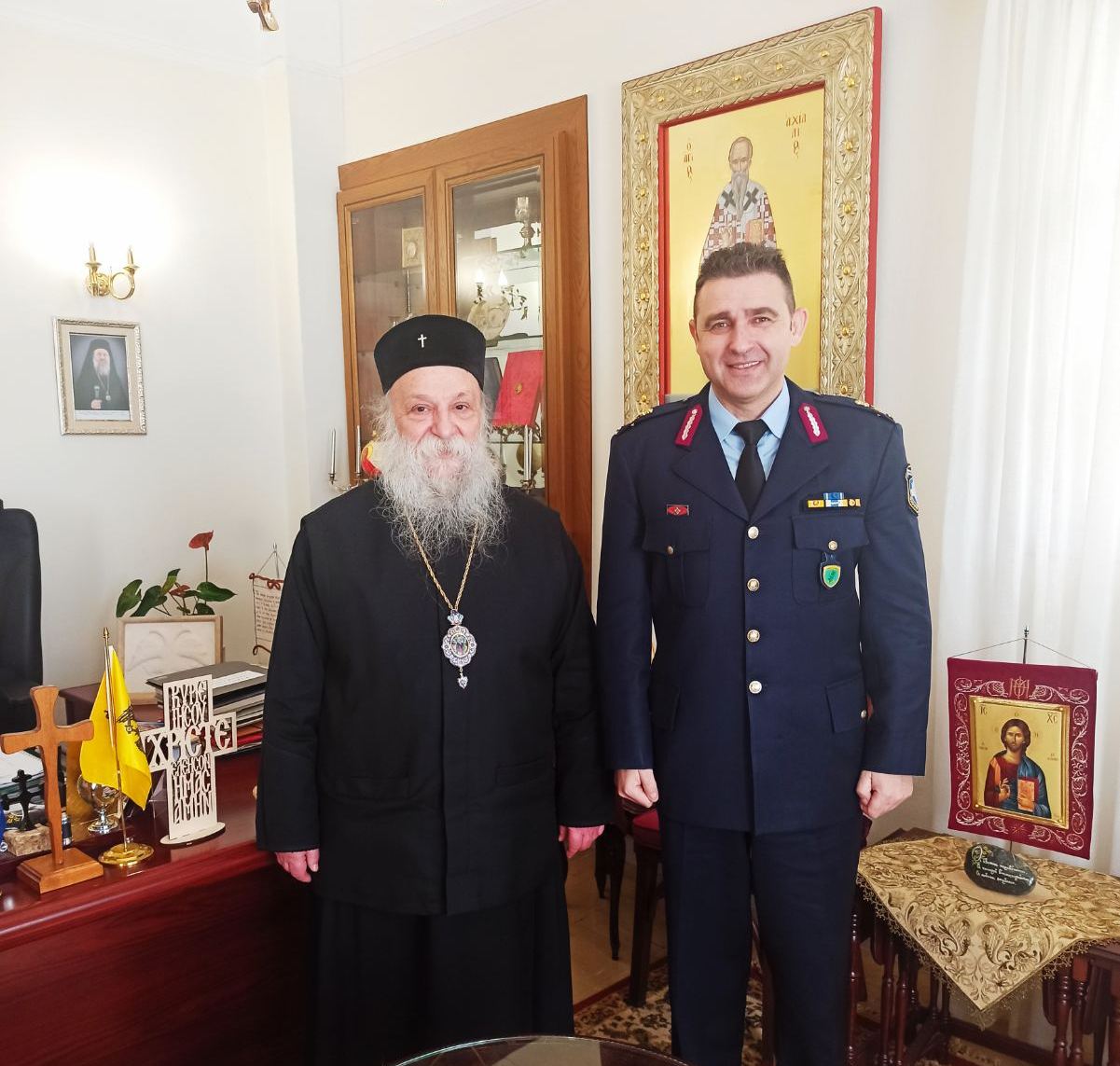 Κατά τη διάρκεια της επίσκεψης, ο Σεβασμιώτατος Μητροπολίτης κ. ΔΑΒΙΔ συνεχάρη θερμά τον Γενικό Περιφερειακό Αστυνομικό Διευθυντή για την ανάληψη των καθηκόντων του μετά τις πρόσφατες κρίσεις στην Ελληνική Αστυνομία, ενώ μέσα σε εγκάρδιο κλίμα συζητήθηκαν θέματα, σχετικά με την καθημερινότητα των πολιτών, την τρέχουσα επικαιρότητα της σύγχρονης ελληνικής κοινωνίας και ζητήματα που εμπίπτουν στο πεδίο ενδιαφέροντος των τοπικών αστυνομικών και εκκλησιαστικών Αρχών.