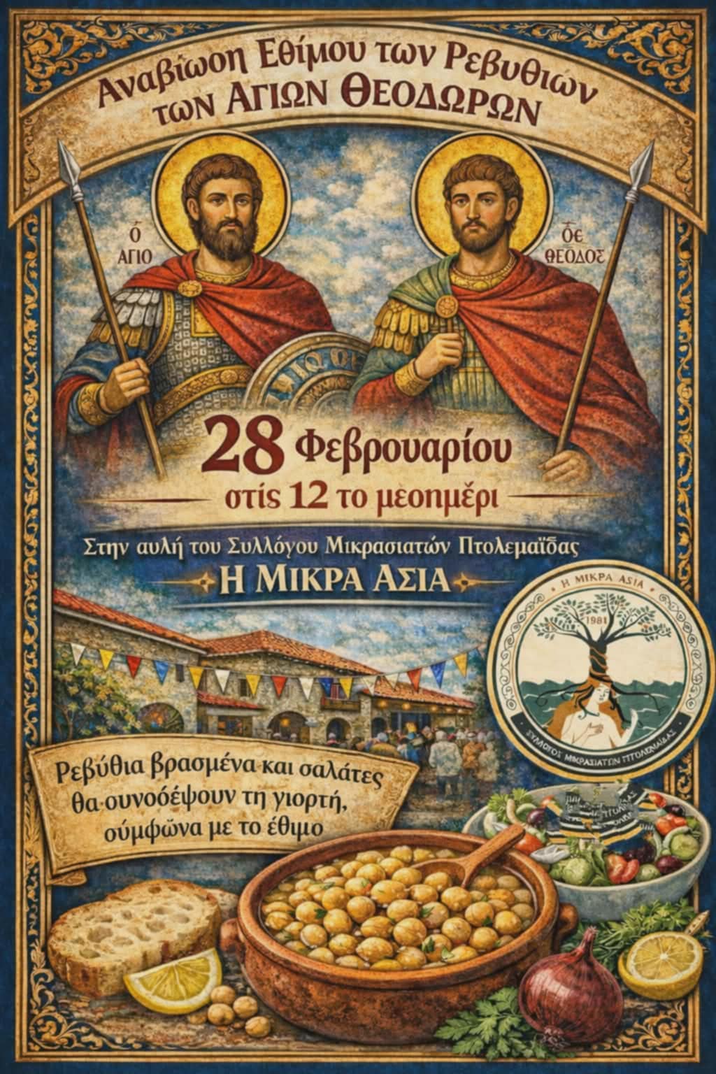 Ο Σύλλογος Μικρασιατών Πτολεμαΐδας, το Σάββατο 28 Φεβρουαρίου στις 12 το μεσημέρι, σας προσκαλεί στην αναβίωση του εθίμου των ρεβιθιών των Αγίων Θεοδώρων. Πρόκειται για έθιμο που χάνεται στα βάθη των αιώνων και συνεχίστηκε μετά το 1922, μέσα στα σπίτια των προσφύγων, κύρια εκείνων που κατάγονταν από την περιοχή της Περγάμου.