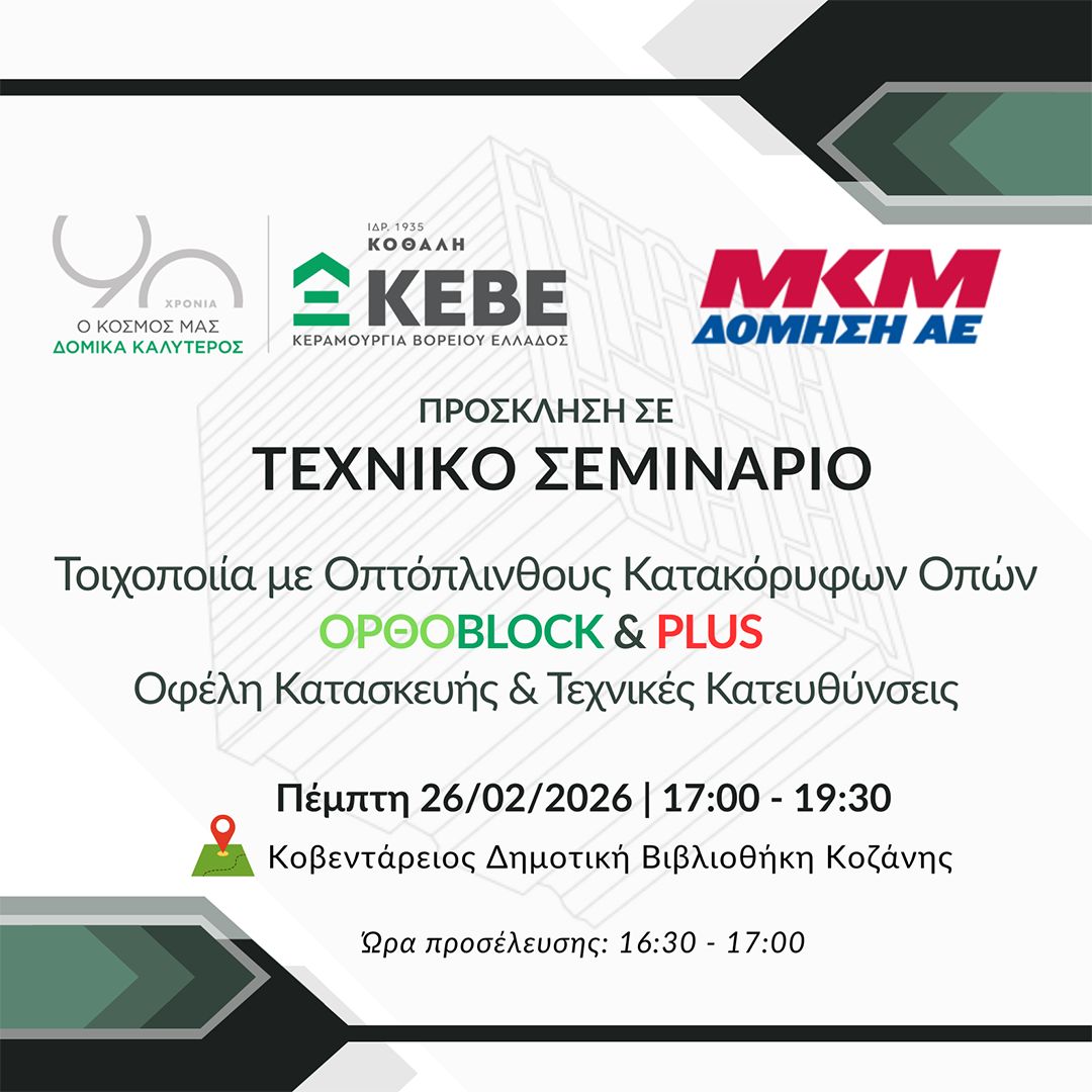 H KE.B.E. A.E. σε συνεργασία με την Μ.Κ.Μ. ΔΟΜΗΣΗ Α.Ε. διοργανώνουν τεχνικό σεμινάριο με θέμα:
