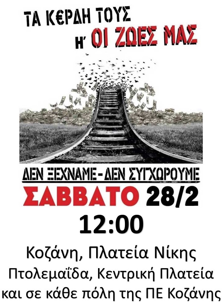 Συντασσόμενοι με το πανελλαδικό κάλεσμα του Συλλόγου θυμάτων Τεμπών, Τοπικών Φορέων και Σωματείων καλούμε όλους τους πολίτες να συμμετάσχουν μαζικά στις κινητοποιήσεις που θα λάβουν χώρα σε όλες τις πόλεις τη ΠΕ Κοζάνης και με σύνθημα ΔΕΝ ΞΕΧΝΑΜΕ/ΔΕΝ ΣΥΓΧΩΡΟΥΜΕ να διεκδικήσουμε φως αντί το σκοτάδι, αλήθεια αντί το ψέμα, δικαιοσύνη αντί συγκάλυψη.