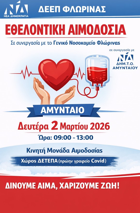 Εθελοντική αιμοδοσία στο Αμύνταιο τη Δευτέρα 2 Μαρτίου .
