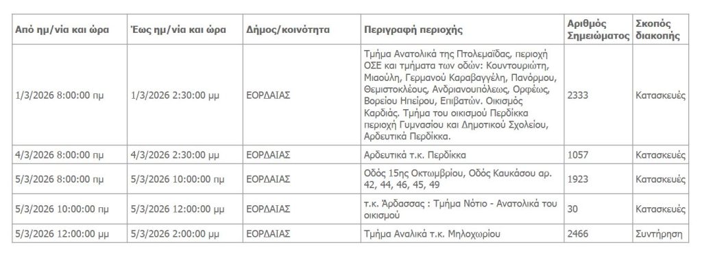 Διακοπές ηλεκτρικού ρεύματος στο Δήμο Εορδαίας 1, 4 & 5 Μαρτίου