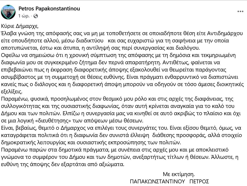 Έλαβα γνώση της απόφασής σας να μη με τοποθετήσετε σε οποιαδήποτε θέση είτε Αντιδημάρχου είτε οπουδήποτε αλλού, μέσω διαδικτύου και σας ευχαριστώ για τη σαφήνεια με την οποία αποτυπώνεται, έστω και άτυπα, η αντίληψή σας περί συνεργασίας και διαλόγου.
