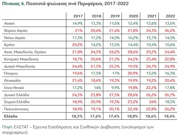 Ο δεύτερος πίνακας προέρχεται από το ΔΙΑΝΕΟΣΙΣ (Μάιος 2024) και παρουσιάζει επίσης τα ποσοστά φτώχειας ανά περιφέρεια.