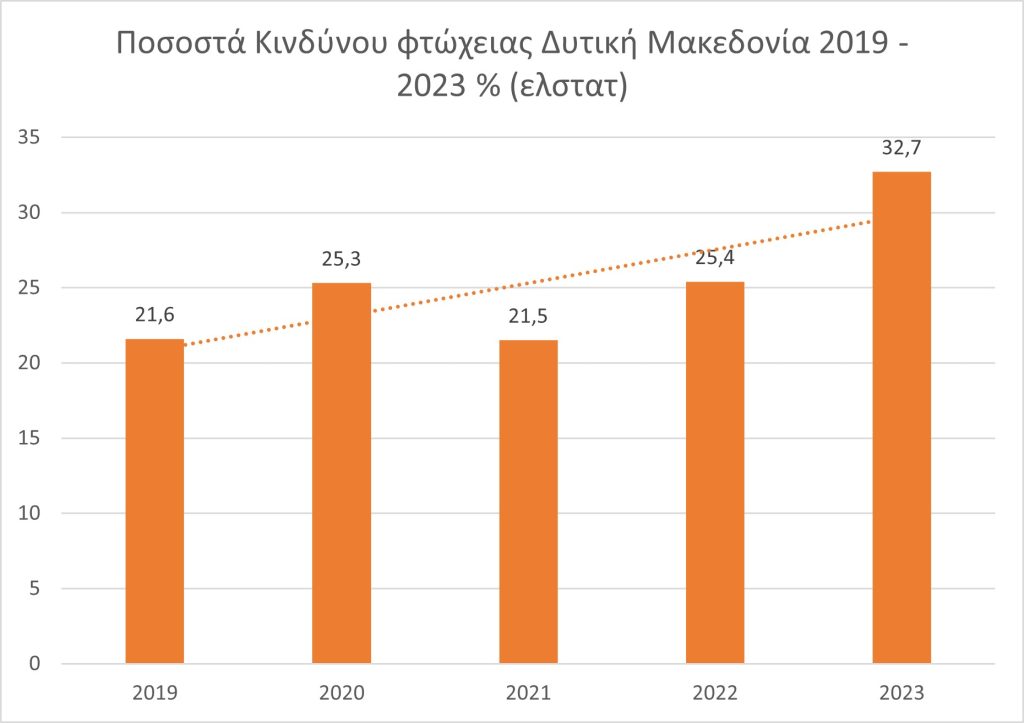 Το τρίτο διάγραμμα, περιλαμβάνει στοιχεία διαθέσιμα στην ΕΛΣΤΑΤ και εμφανίζει τα ποσοστά κινδύνου φτώχειας για την περίοδο 2019–2023 στη Δυτική Μακεδονία.