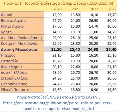 Ο πρώτος πίνακας προέρχεται από το Ινστιτούτο ΕΝΑ (24.02.2026) και αποτυπώνει τα ποσοστά φτώχειας ανά περιφέρεια για τα έτη 2020–2023, αναδεικνύοντας τις εισοδηματικές ανισότητες.