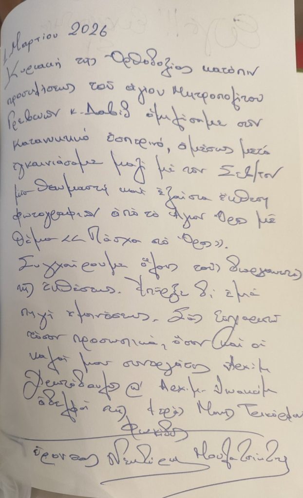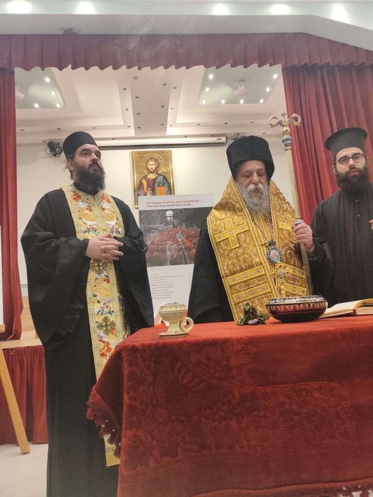 Στον σύντομο αλλά ουσιαστικό χαιρετισμό του, ο Σεβασμιώτατος τόνισε χαρακτηριστικά ότι «οφείλουμε και εμείς να εξέλθουμε από το σκοτάδι της απελπισίας και να ζήσουμε στο φως της Αναστάσεως, ώστε η ζωή μας να είναι χαρούμενη, όπως οι χαρμόσυνες και αναστάσιμες λιτανείες του Αγίου Όρους».