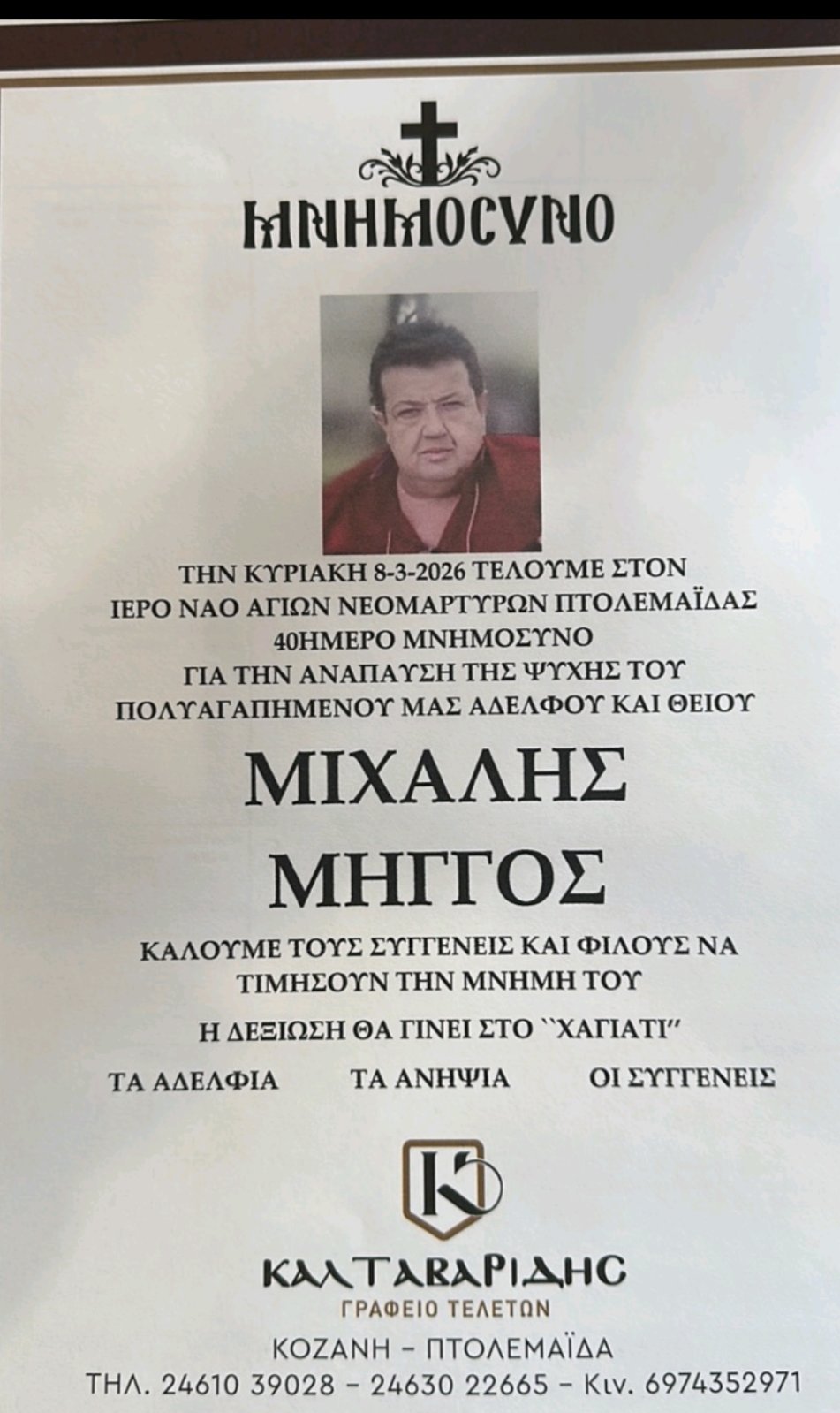 40ημερο μνημόσυνο του Μιχάλη Μήγγου την Κυριακή 8/3