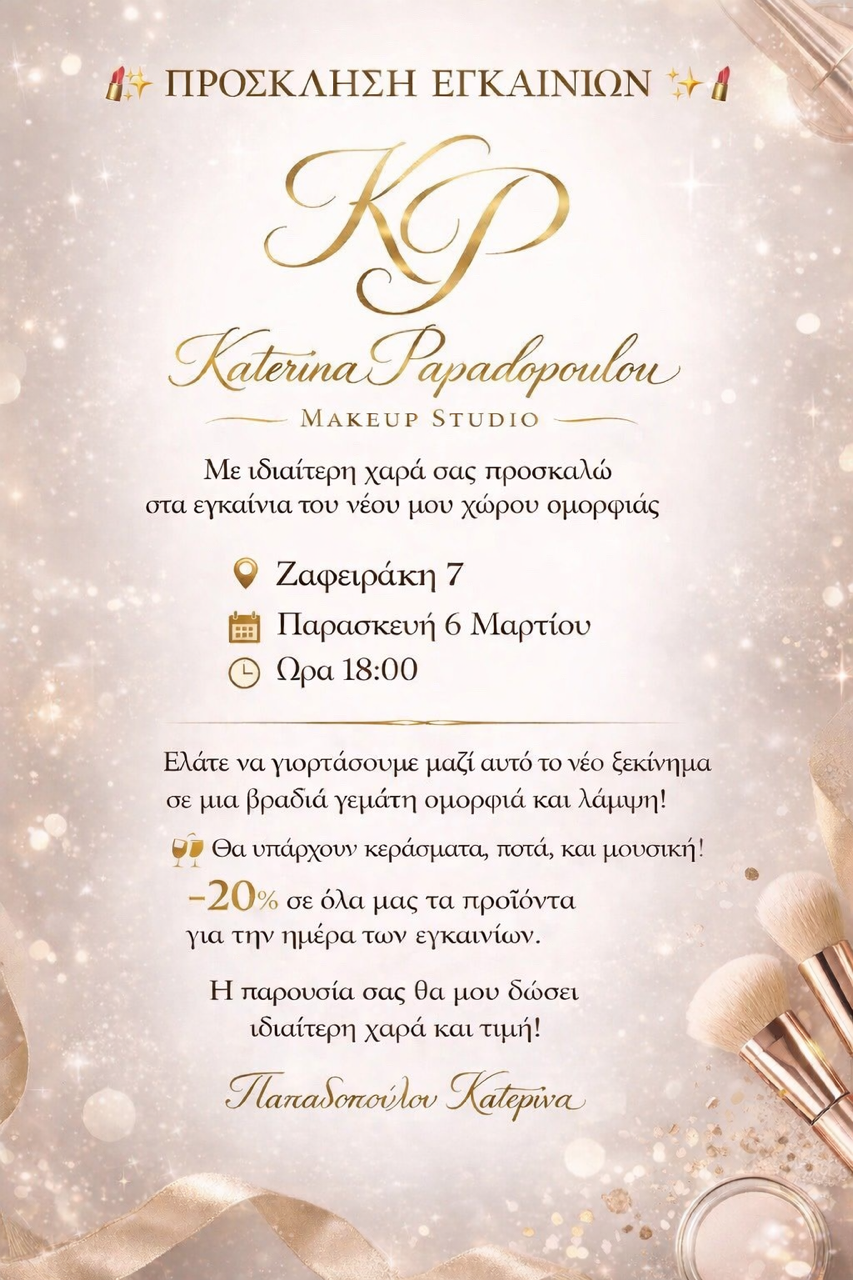 Με ιδιαίτερη χαρά σας προσκαλώ στα εγκαίνια του νέου μου χώρου ομορφιάς