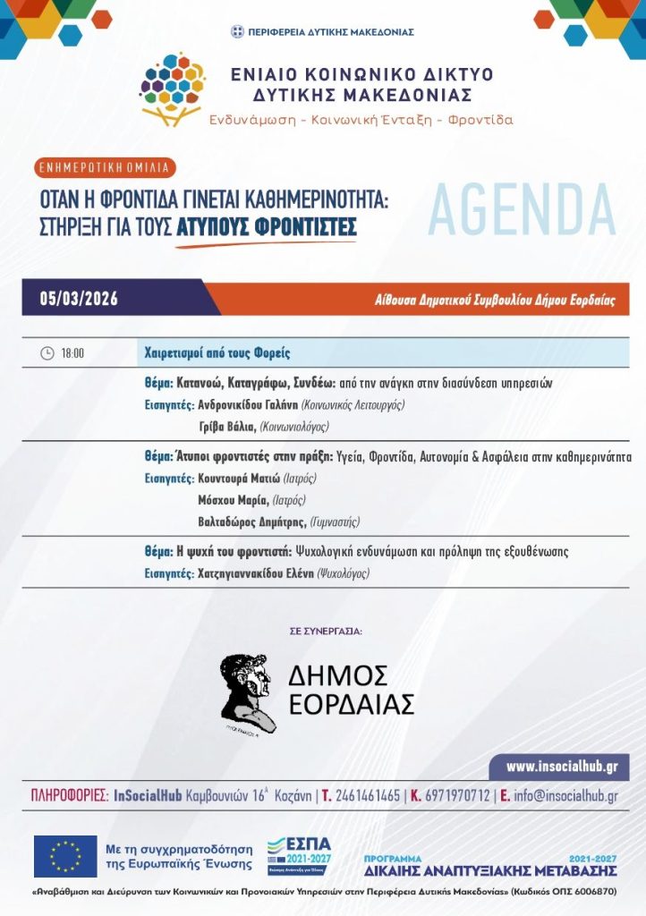 Ο Δήμος Εορδαίας σε συνεργασία με το Ενιαίο Κοινωνικό Δίκτυο Δυτικής Μακεδονίας ,διοργανώνουν ενημερωτική εκδήλωση με θέμα: