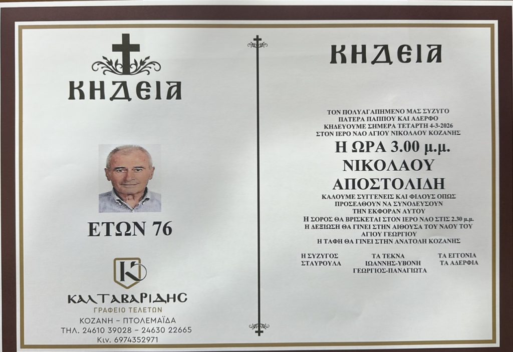 Έφυγε από την ζωή, σε ηλικία 76 ετών, ο Ν. Αποστολίδης. Η κηδεία του θα γίνει σήμερα Τετάρτη 4/3 στις 3 το μεσημέρι στον Ι.Ν. Αγ. Νικολάου Κοζάνης.