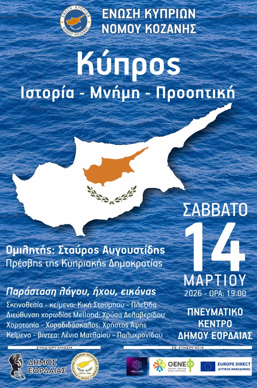 Η Ένωση Κυπρίων Νομού Κοζάνης, σε συνδιοργάνωση με τον Δήμο Εορδαίας και την Ομοσπονδία Κυπριακών Οργανώσεων Ελλάδας, διοργανώνει το Σάββατο 14 Μαρτίου 2026 και ώρα 19.00 στο Πνευματικό Κέντρο Δήμου Εορδαίας εκδήλωση με θέμα «Κύπρος: Ιστορία, Μνήμη, Προοπτική».
