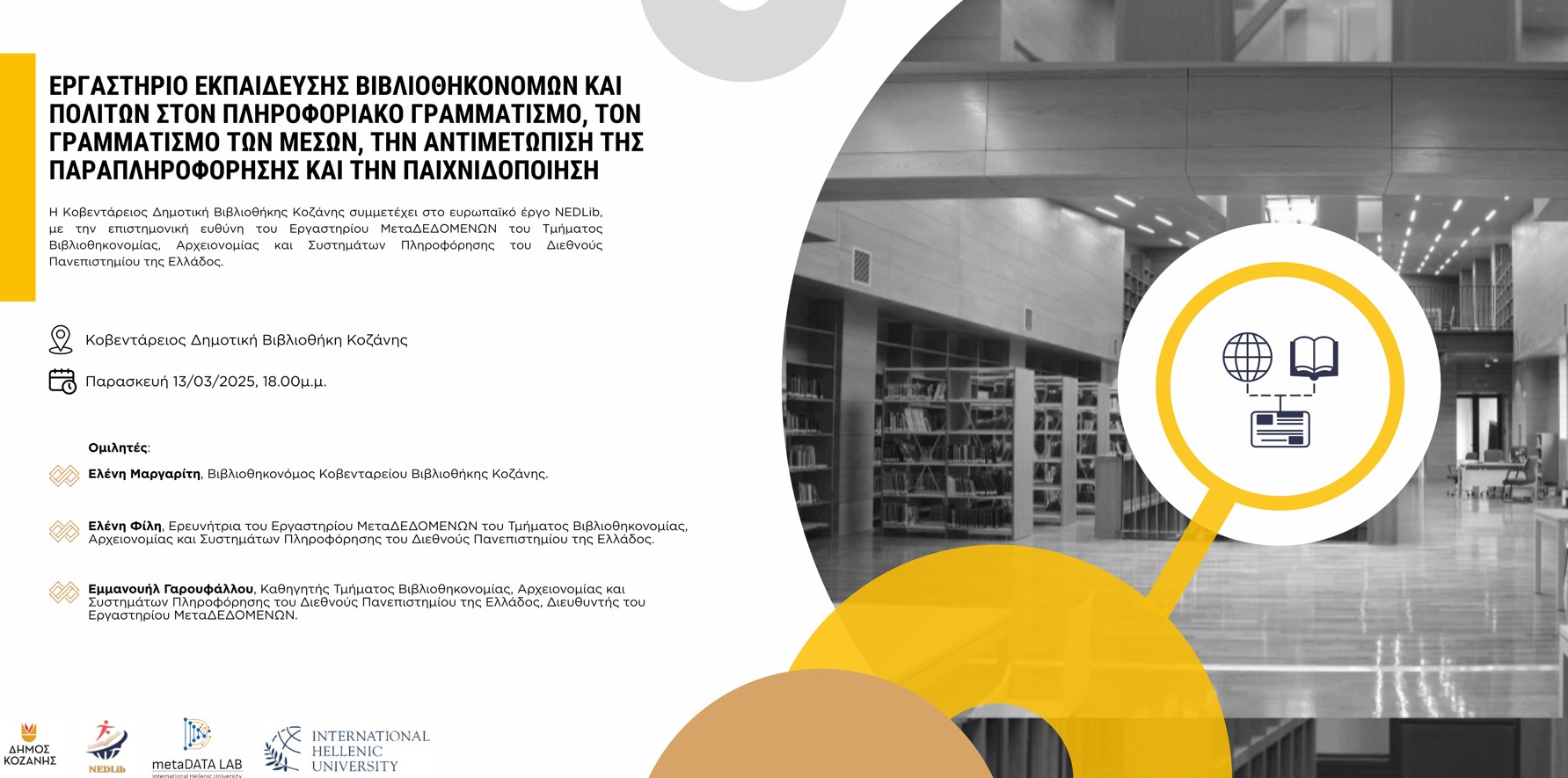 Στο πλαίσιο του ευρωπαϊκού έργου NEDLib, αναπτύχθηκε ένα ολοκληρωμένο εκπαιδευτικό πρόγραμμα για την ενίσχυση των γνώσεων και δεξιοτήτων των βιβλιοθηκονόμων, των εκπαιδευτικών και των πολιτών σε θέματα πληροφοριακού και ψηφιακού γραμματισμού. Το πρόγραμμα βασίζεται στη δημιουργία τεσσάρων εξειδικευμένων εγχειριδίων και στην ανάπτυξη πρακτικών δραστηριοτήτων, τα οποία στοχεύουν στην υποστήριξη των βιβλιοθηκών ως χώρων μάθησης, ενημέρωσης και ενίσχυσης της κριτικής σκέψης των πολιτών. Το εκπαιδευτικό υλικό διατίθεται σε ελεύθερη πρόσβαση, ώστε να μπορεί να αξιοποιηθεί από επαγγελματίες των βιβλιοθηκών και της εκπαίδευσης για την οργάνωση αντίστοιχων δράσεων και εκπαιδευτικών προγραμμάτων και χωρίζεται σε τέσσερις ενότητες: