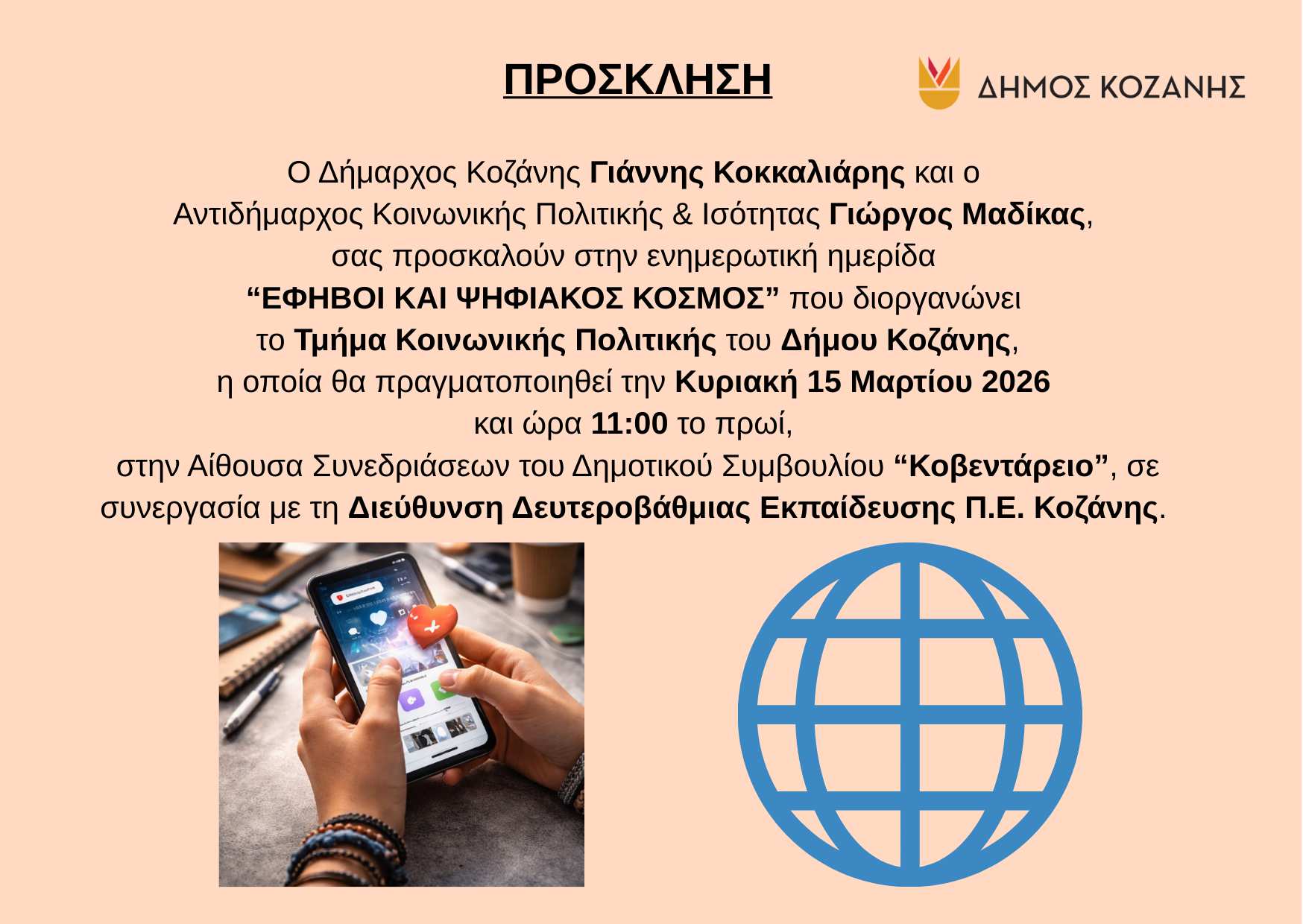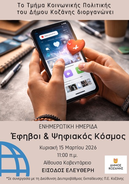 Το Τμήμα Κοινωνικής Πολιτικής Δήμου Κοζάνης σας προσκαλεί στην ενημερωτική εκδήλωση που διοργανώνει με θέμα «Έφηβοι και Ψηφιακός Κόσμος: Ευκαιρίες, Κίνδυνοι και Υγιή Όρια», η οποία θα πραγματοποιηθεί την Κυριακή 15 Μαρτίου 2026 και ώρα 11:00 το πρωί, στην Αίθουσα Συνεδριάσεων του Δημοτικού Συμβουλίου “Κοβεντάρειο”, με ελεύθερη είσοδο.