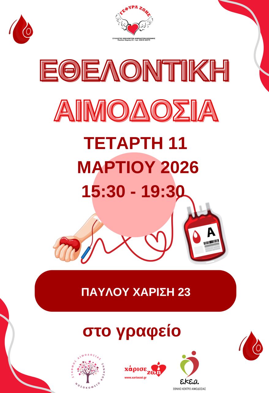 Την Τετάρτη 11 Μαρτίου, από 15:30 έως 19:30, σας περιμένουμε στα γραφεία του Συλλόγου μας (Παύλου Χαρίση 23) για να συμμετάσχετε στην 8η Εθελοντική Αιμοδοσία.