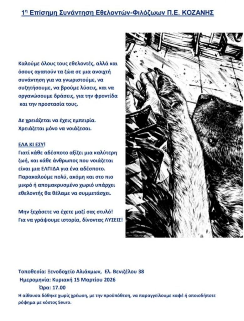 Μια ανοιχτή συνάντηση για την προστασία και τη φροντίδα των αδέσποτων ζώων διοργανώνεται στην Κοζάνη, με στόχο τη γνωριμία, τη συνεργασία και την αναζήτηση λύσεων για τα προβλήματα που αντιμετωπίζουν τα ζώα της περιοχής.