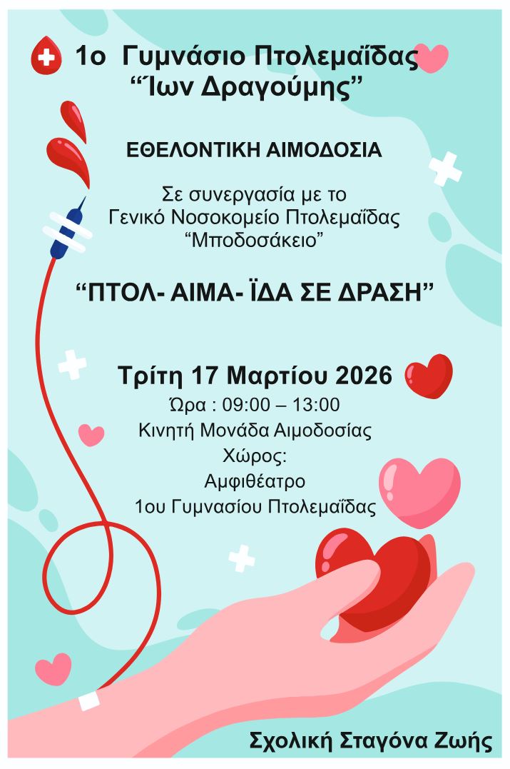 Το 1ο Γυμνάσιο Πτολεμαΐδας «Ίων Δραγούμης», σε συνεργασία με το Γενικό Νοσοκομείο Πτολεμαΐδας «Μποδοσάκειο», διοργανώνει εθελοντική αιμοδοσία με σύνθημα: