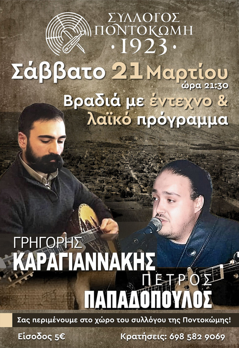 Σύλλογος «Ποντοκώμη 1923»: Μια μοναδική βραδιά με έντεχνο & λαϊκό πρόγραμμα με τους ΓΡΗΓΟΡΗ ΚΑΡΑΓΙΑΝΝΑΚΗ και ΠΕΤΡΟ ΠΑΠΑΔΟΠΟΥΛΟ το Σάββατο 21 Μαρτίου !