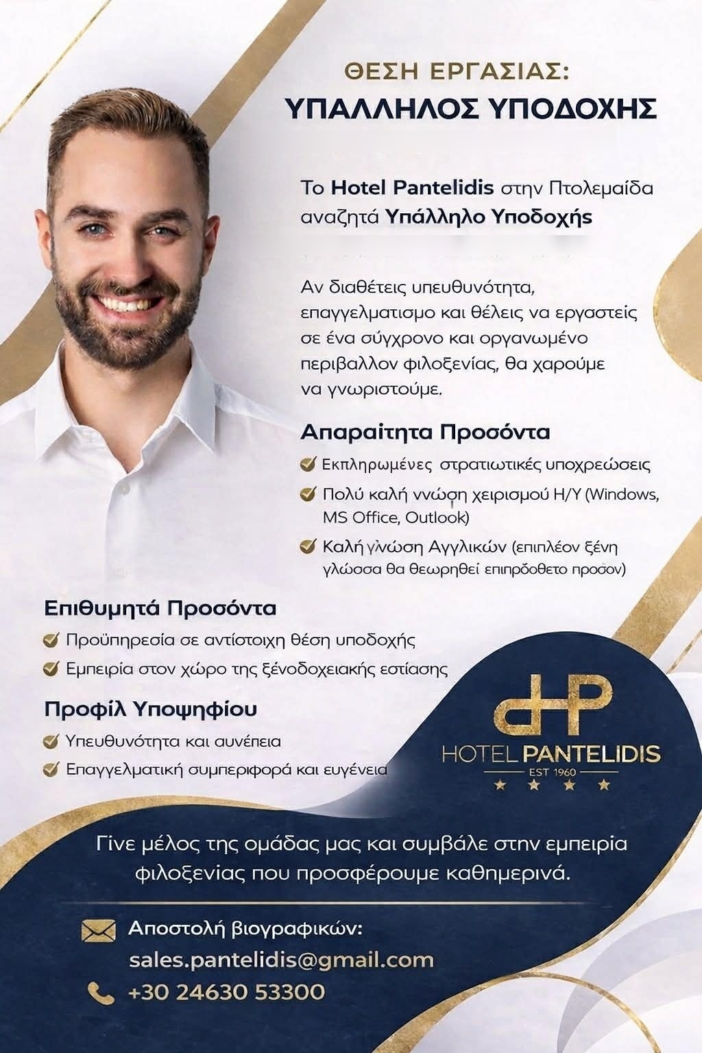 Ζητείται υπάλληλος (άνδρας) για την Υποδοχή του ξενοδοχείου Παντελίδης στην Πτολεμαΐδα .