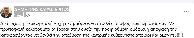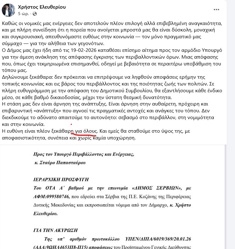 Έμμεση αιχμή κι από τον Δήμαρχο Σερβίων Χ. Ελευθερίου που έγραψε: