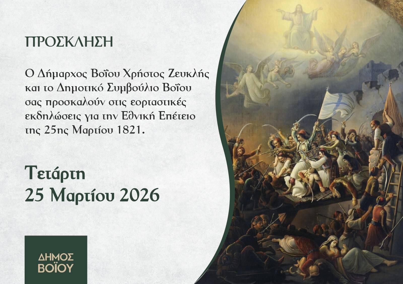 Γενικός σημαιοστολισμός όλων των Δημόσιων, Δημοτικών, Ιδιωτικών Καταστημάτων και Οικιών, από την 8η πρωινή ώρα της 23ης ως τη δύση του ηλίου της 25ης Μαρτίου 2026.