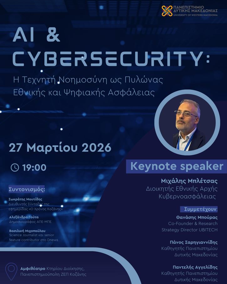 Σε μια εποχή όπου η τεχνητή νοημοσύνη εξελίσσεται ραγδαία, η ασφάλεια και η αξιοπιστία των ψηφιακών συστημάτων τίθενται στο επίκεντρο. Σε αυτό το πλαίσιο, το Πανεπιστήμιο Δυτικής Μακεδονίας διοργανώνει την εκδήλωση «AI & Cybersecurity: Η Τεχνητή Νοημοσύνη ως Πυλώνας Εθνικής και Ψηφιακής Ασφάλειας», την Παρασκευή 27 Μαρτίου 2026, στις 19:00, στο Αμφιθέατρο του Κτηρίου Διοίκησης, στην Πανεπιστημιούπολη ΖΕΠ Κοζάνης.