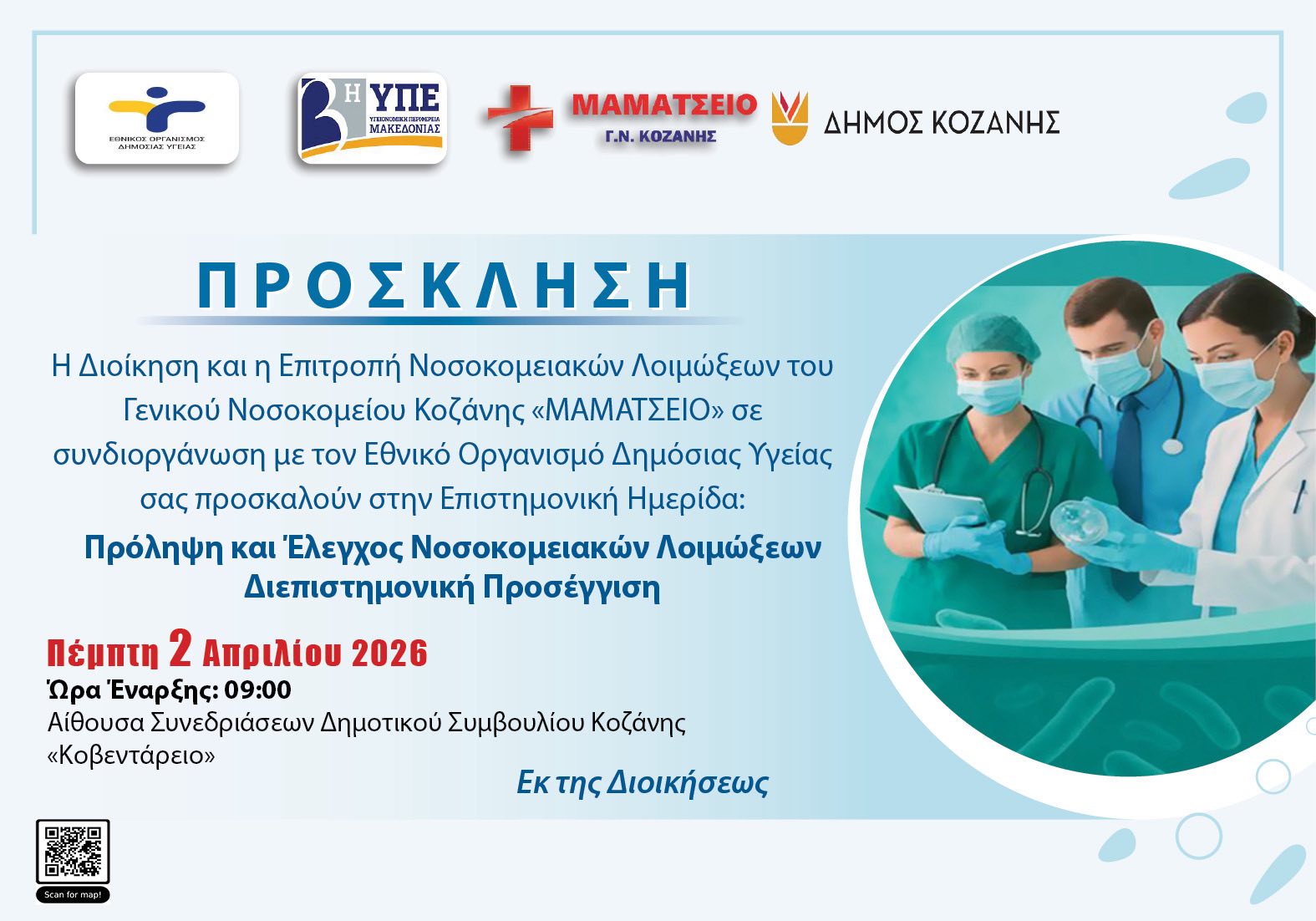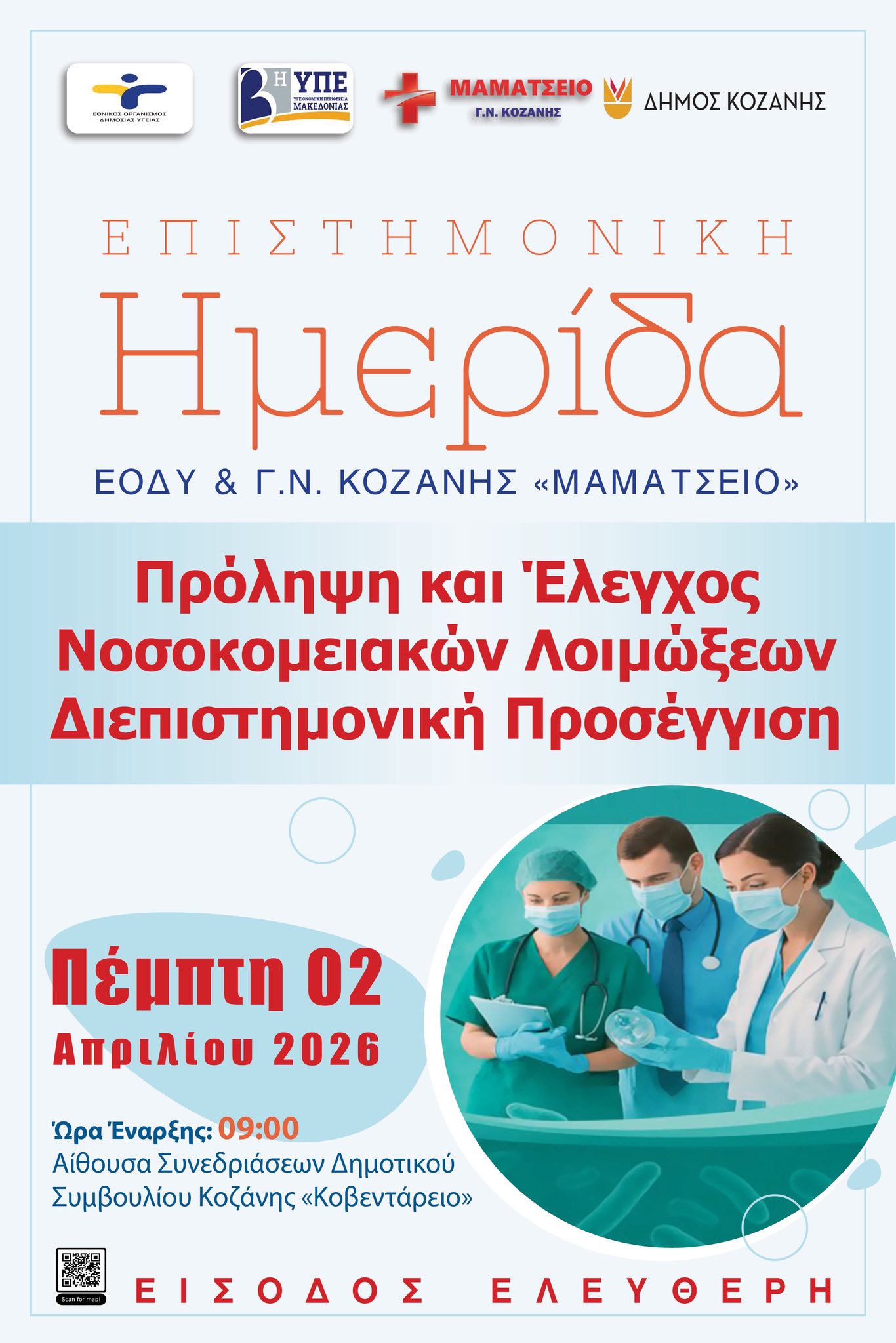 Η Διοίκηση και η Επιτροπή Νοσοκομειακών Λοιμώξεων του Γενικού Νοσοκομείου Κοζάνης «Μαμάτσειο», σε συνδιοργάνωση με τον Εθνικό Οργανισμό Δημόσιας Υγείας (ΕΟΔΥ), διοργανώνουν Επιστημονική Ημερίδα με θέμα: «Πρόληψη και Έλεγχος Νοσοκομειακών Λοιμώξεων – Διεπιστημονική Προσέγγιση».