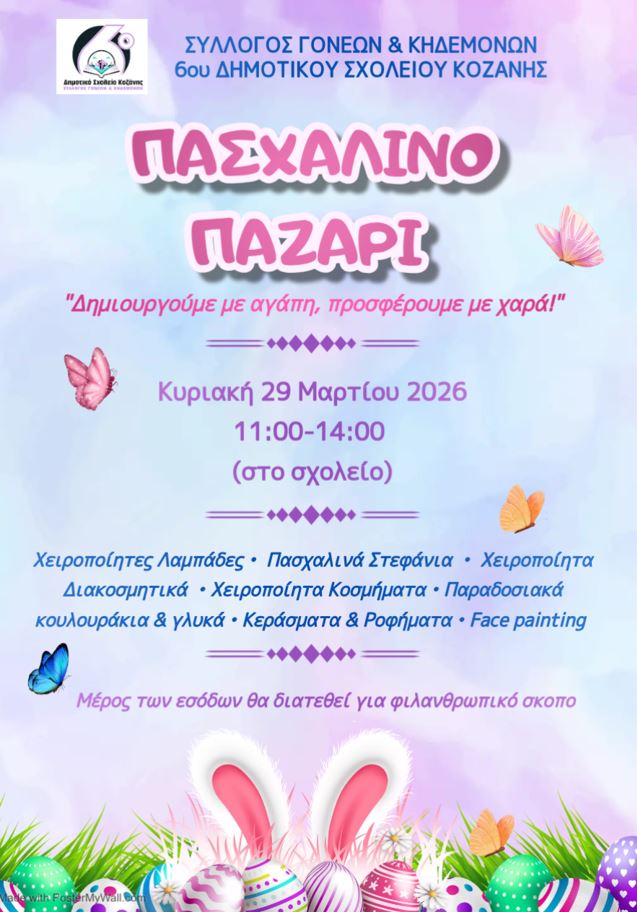 Ο Σύλλογος Γονέων και Κηδεμόνων του 6ου Δημοτικού Σχολείου Κοζάνης σας προσκαλεί με μεγάλη χαρά στο Πασχαλινό Παζάρι που διοργανώνει την Κυριακή 29 Μαρτίου 2026. Οι μαθητές, οι εκπαιδευτικοί και οι γονείς ένωσαν τις δυνάμεις τους με πολύ μεράκι και φαντασία για να δημιουργήσουν μοναδικές πασχαλινές κατασκευές. Με σύνθημα “Δημιουργούμε με αγάπη, προσφέρουμε με χαρά!”, η εκδήλωση θα πραγματοποιηθεί στον χώρο του σχολείου από τις 11:00 έως τις 14:00. Οι επισκέπτες θα έχουν την ευκαιρία να βρουν μοναδικές δημιουργίες και να απολαύσουν όμορφες στιγμές, όπως:• Χειροποίητες Λαμπάδες και Πασχαλινά Στεφάνια.