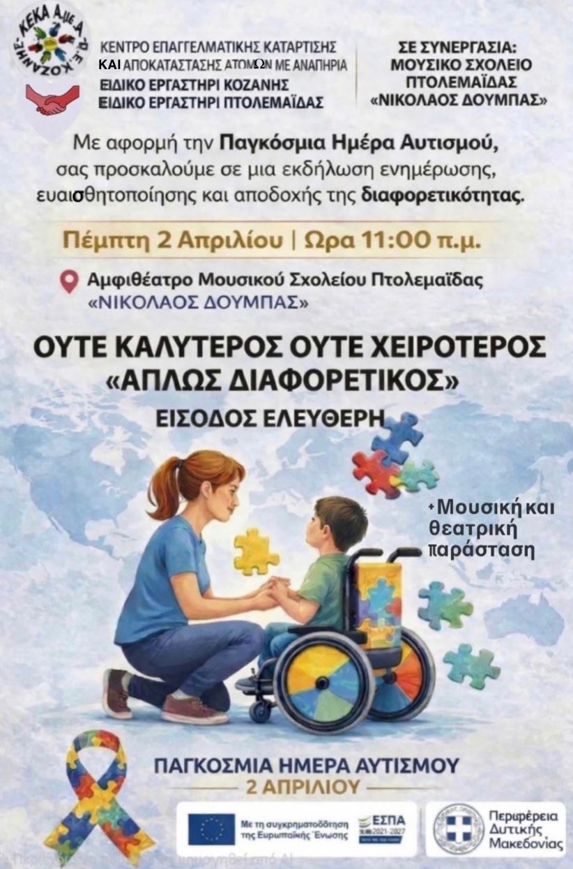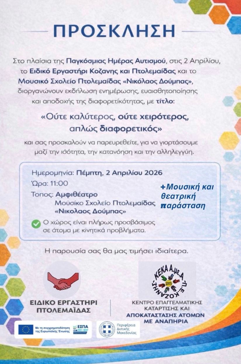 Με αφορμή την Παγκόσμια Ημέρα Αυτισμού, το Ειδικό Εργαστήρι Κοζάνης και Πτολεμαΐδας σε συνεργασία με το Μουσικό Σχολείο Πτολεμαΐδας «Νικόλαος Δούμπας», διοργανώνουν εκδήλωση ενημέρωσης, ευαισθητοποίησης και αποδοχής της διαφορετικότητας. Η εκδήλωση θα πραγματοποιηθεί την Πέμπτη 2 Απριλίου 2026 και ώρα 11:00, στο Αμφιθέατρο του Μουσικού Σχολείου Πτολεμαΐδας «Νικόλαος Δούμπας».