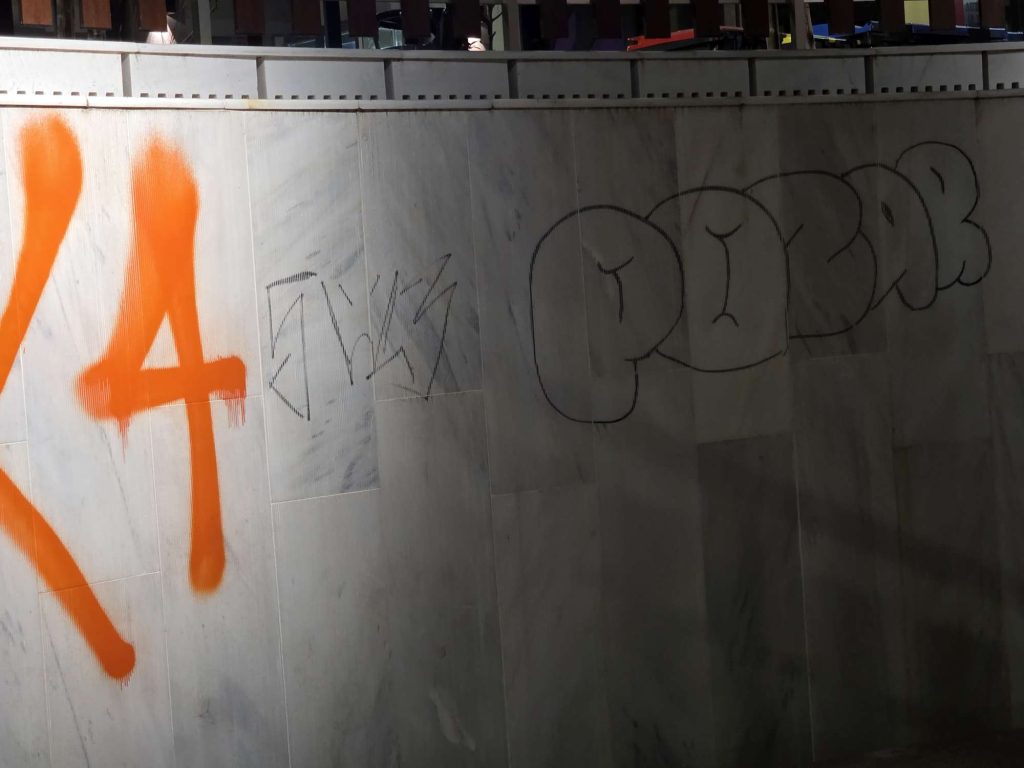 Η πλατεία Λασσάνη, από τους πιο πρόσφατα αναπλασμένους χώρους της Κοζάνης κι ήδη κάποιοι δεν τη σεβάστηκαν. Πάνω σε καθαρές επιφάνειες κάποιοι επέλεξαν να “γράψουν”, αλλοιώνοντας την εικόνα ενός χώρου που δημιουργήθηκε για όλους.