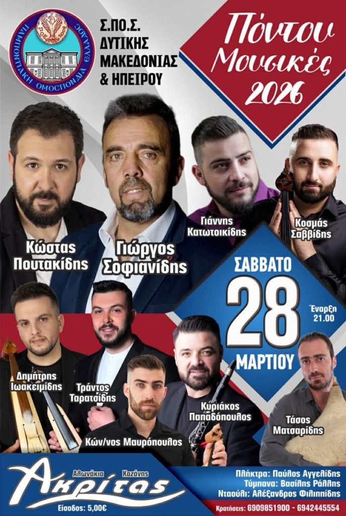 Πόντου Μουσικές 2026, από Σ.ΠΟ.Σ. Δ. Μακεδονίας & Ηπείρου, το Σάββατο 228 Μαρτίου.